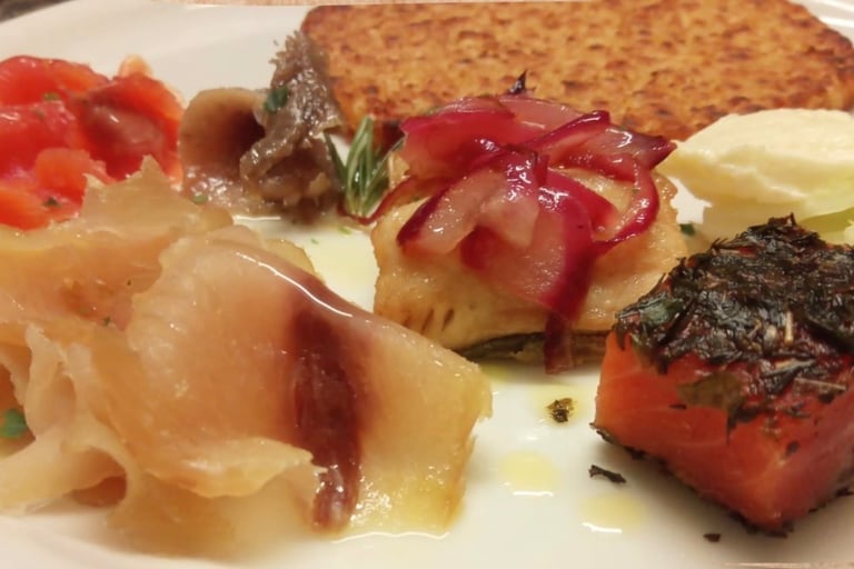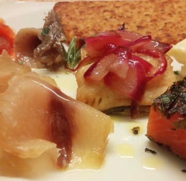 Baccalà mantecato in tre colori (barbabietola rossa, basilico verde e baccalà classico), con sedano rapa in agrodolce (3,5,12)